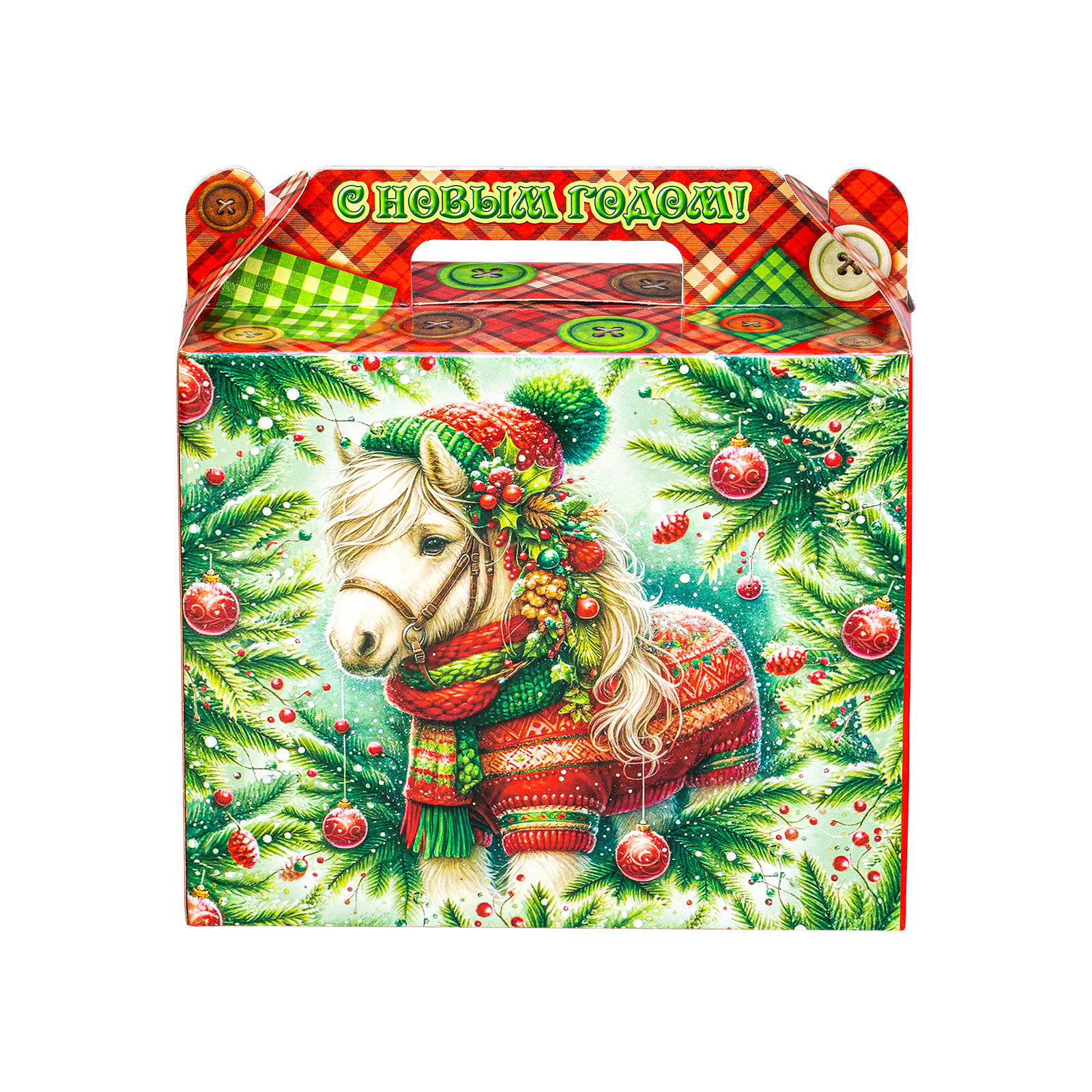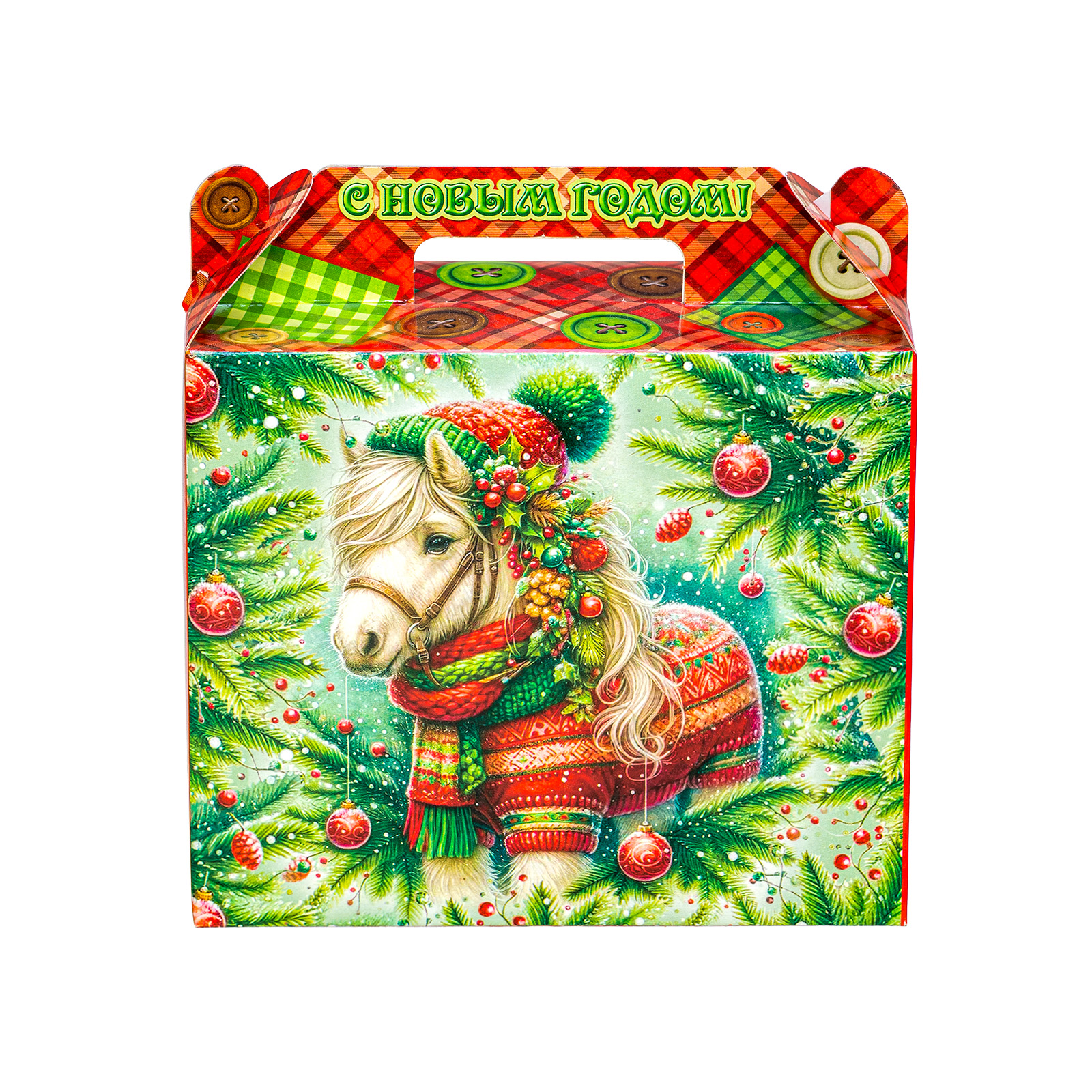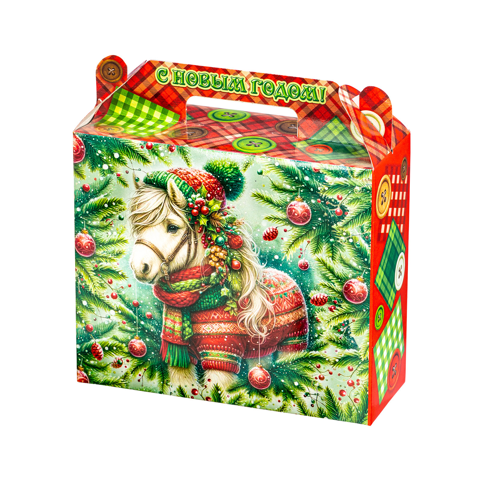 Интересный вариант новогоднего подарка – «Пуговка». Он представлен в разделе Картон. Отлично подойдет на подарок в 2026 году с символом Лошадь. Внутри такого презента находится кондитерский набор весом 500 граммов.