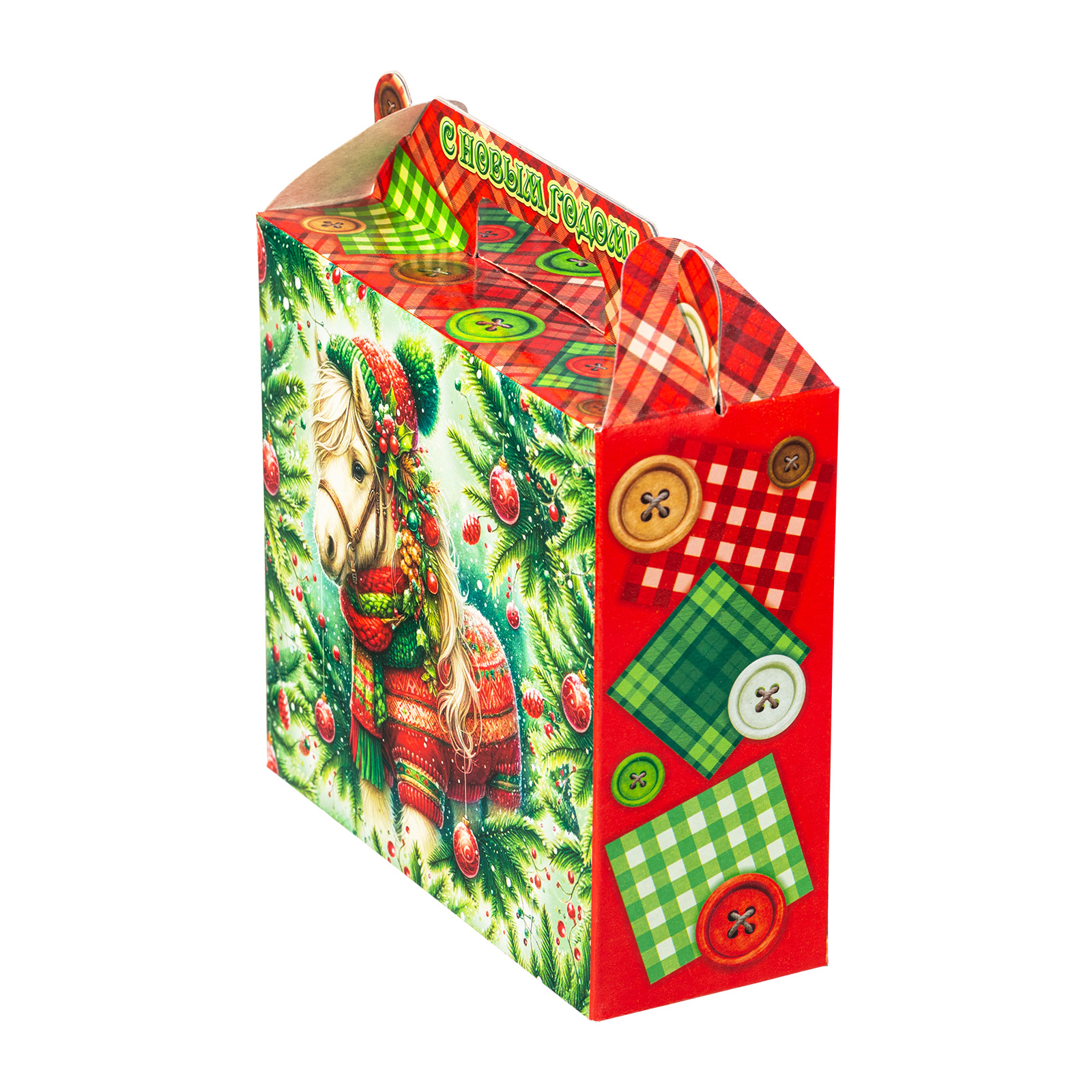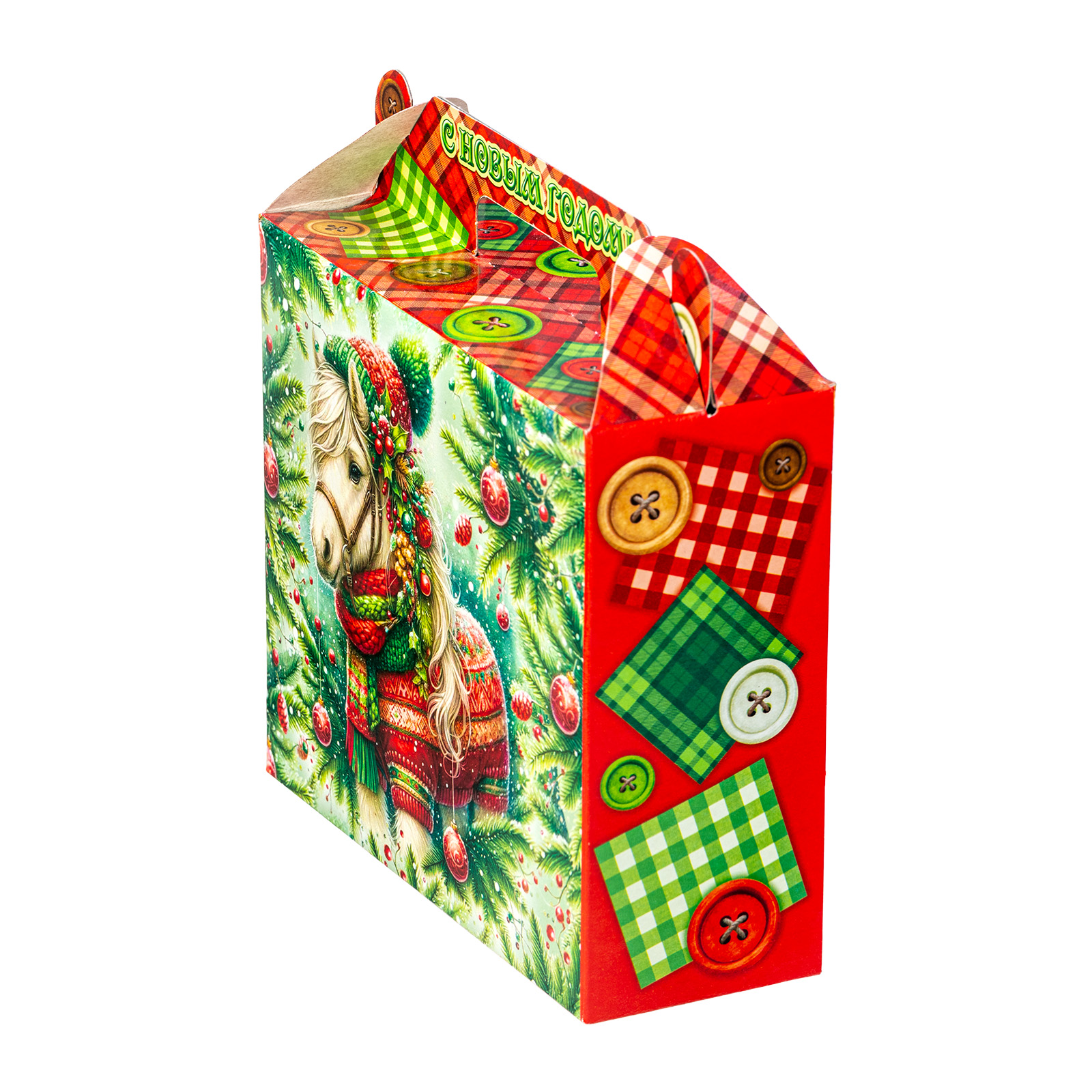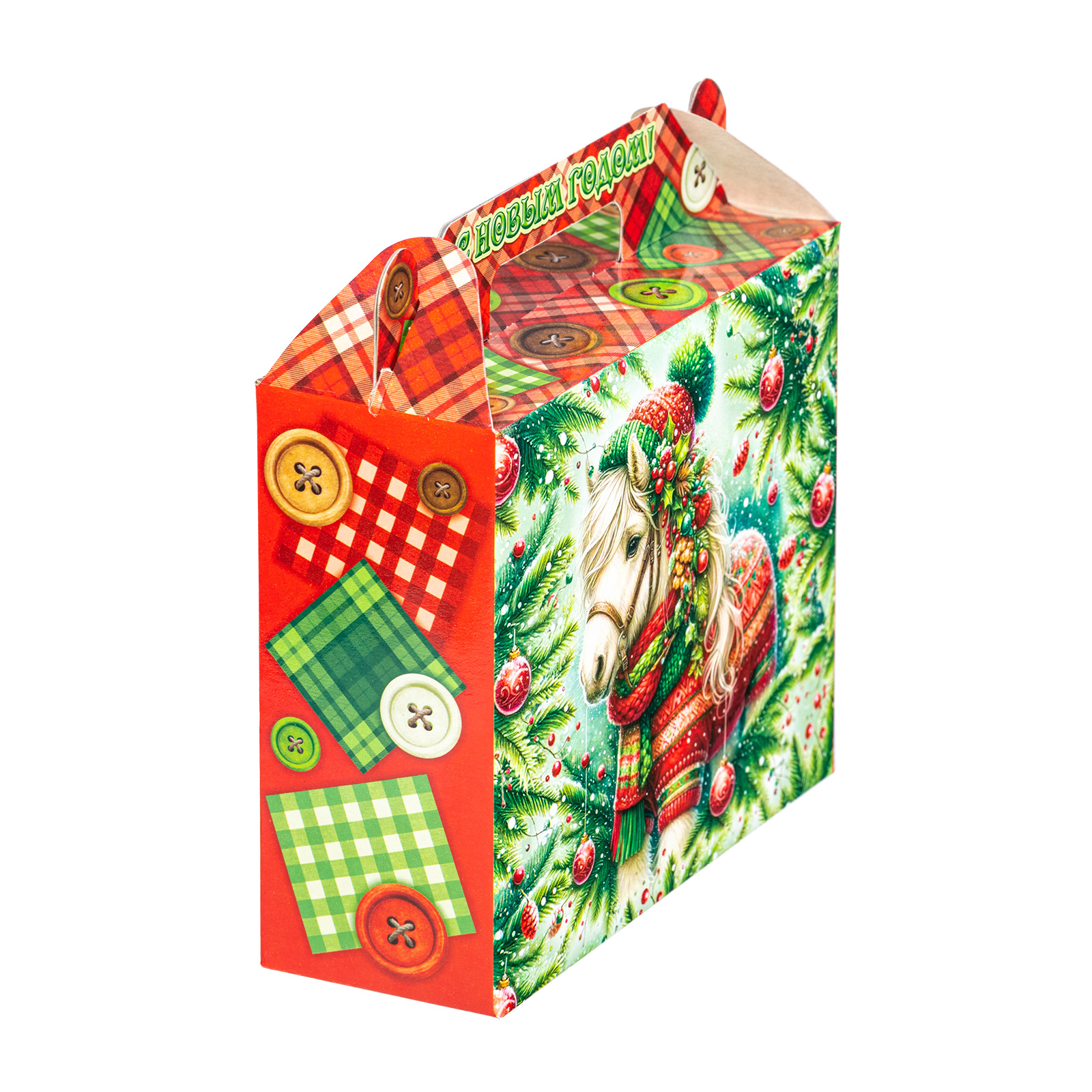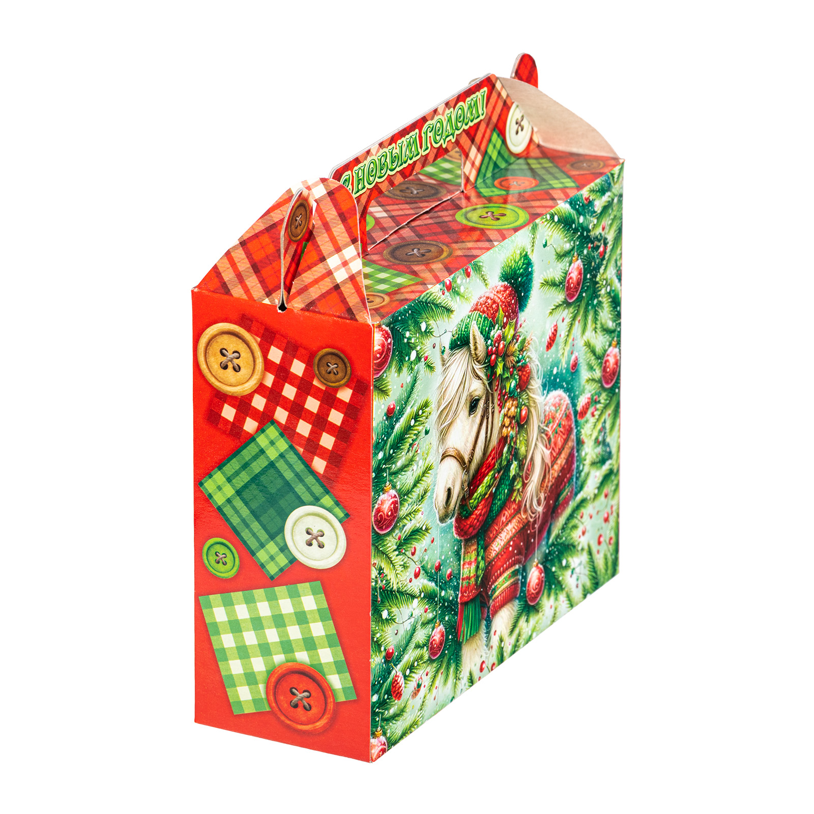 Интересный вариант новогоднего подарка – «Пуговка». Он представлен в разделе Картон. Отлично подойдет на подарок в 2026 году с символом Лошадь. Внутри такого презента находится кондитерский набор весом 500 граммов.