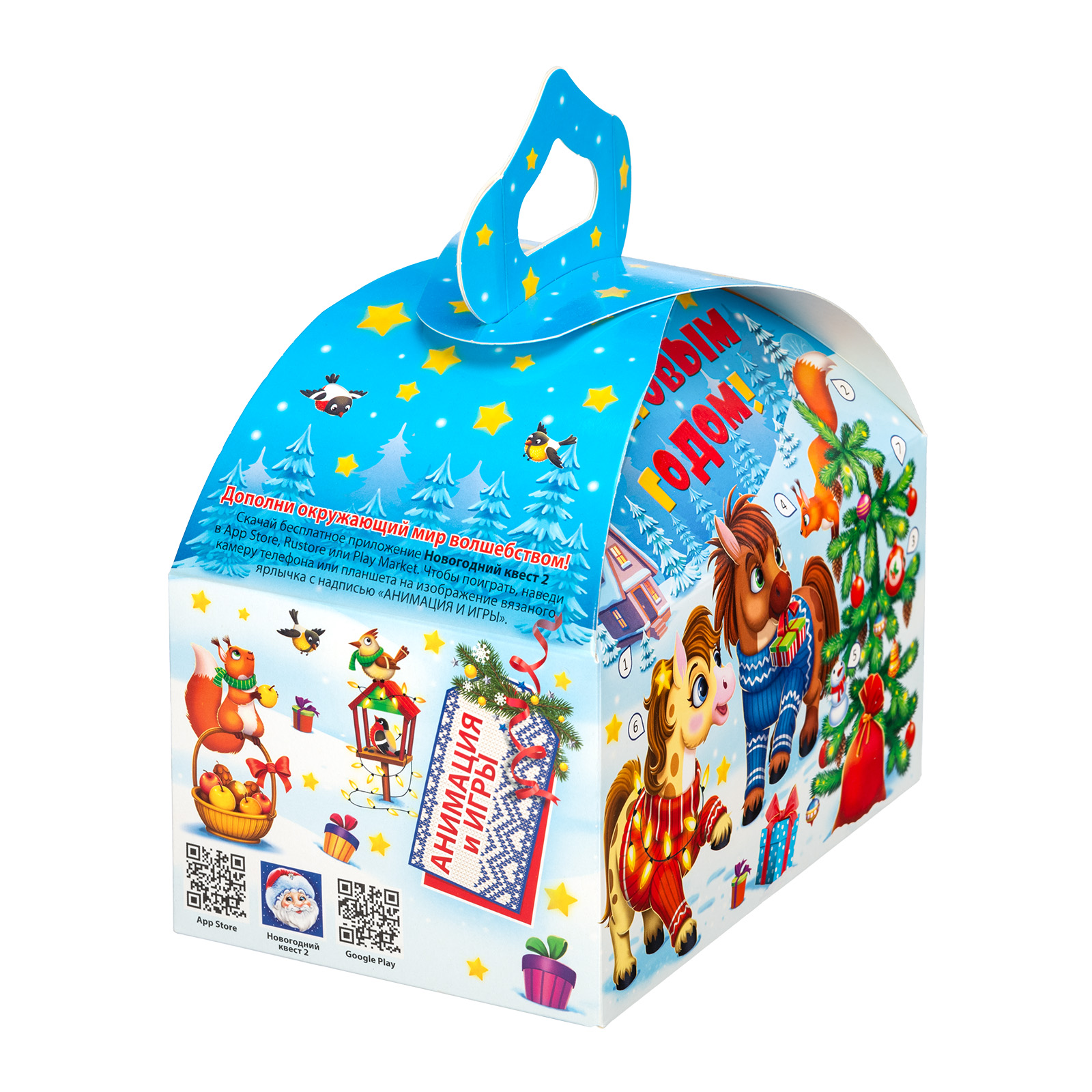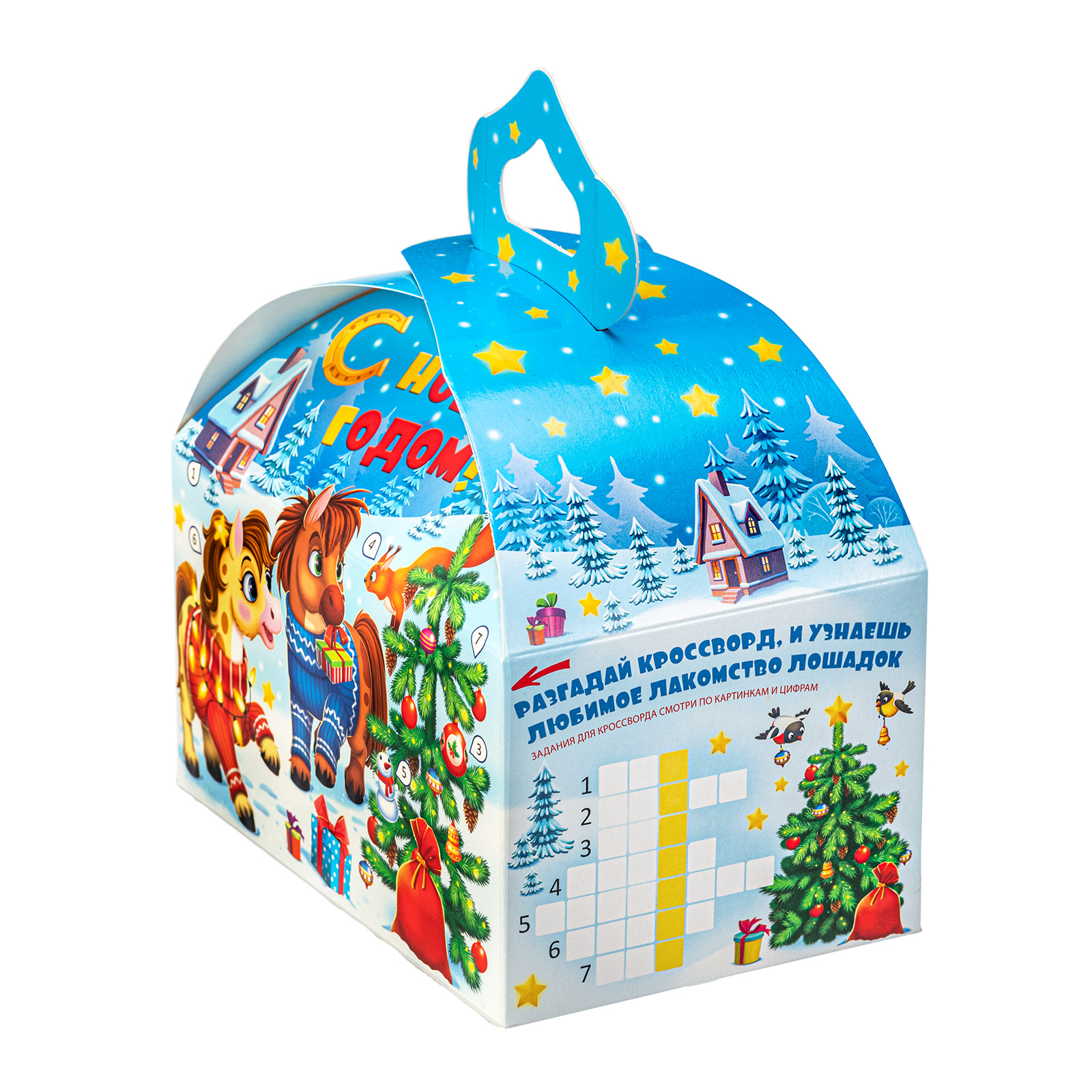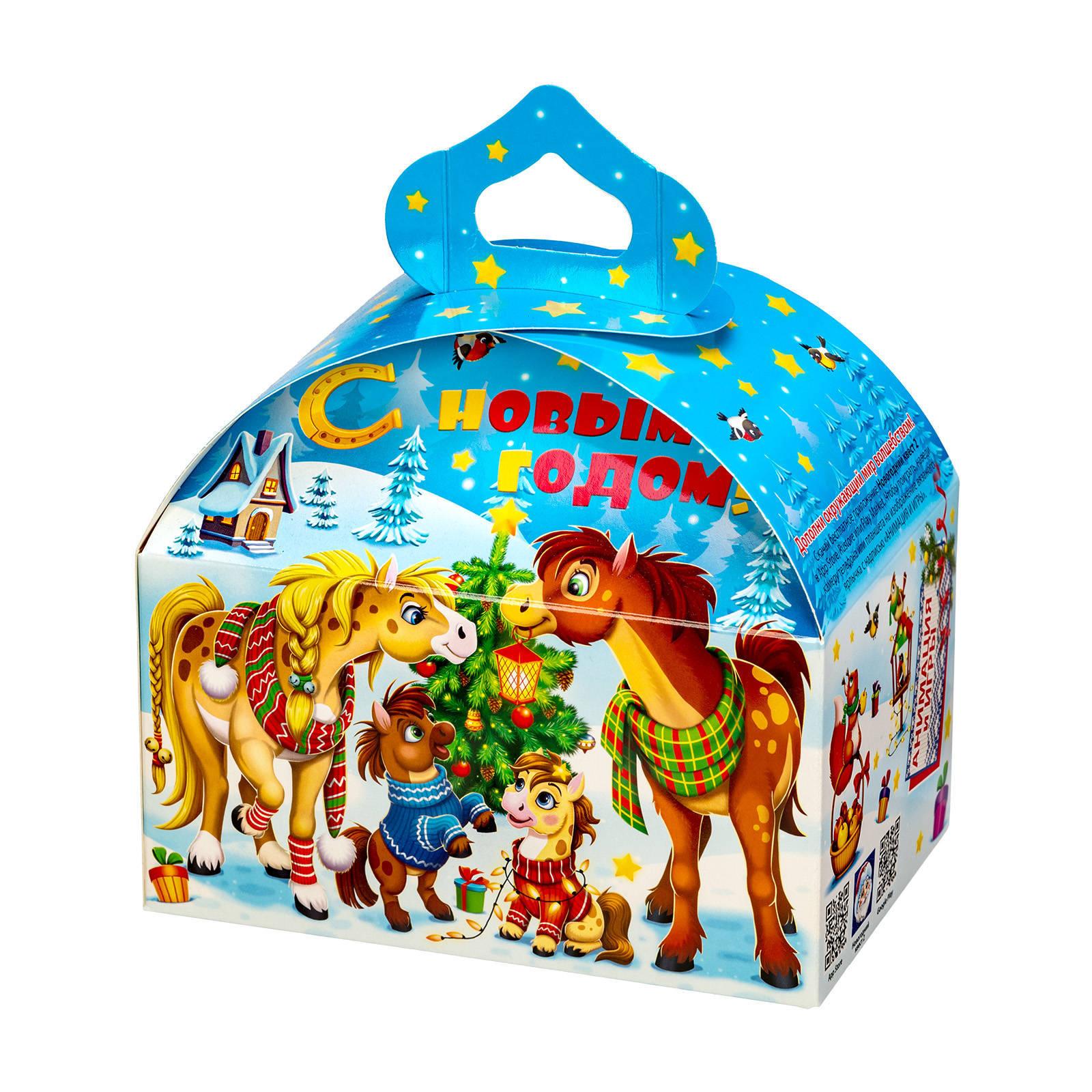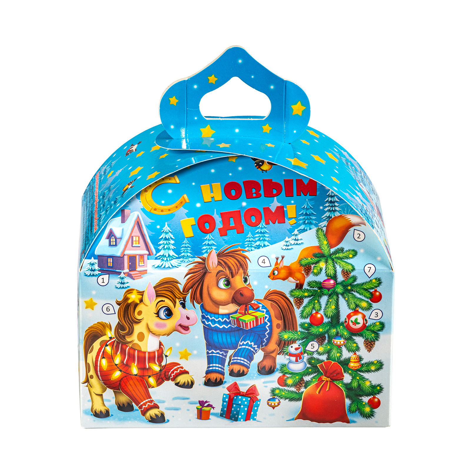 Новогодние сладкие подарки в картонной упаковке - это универсальный вариант для сластены любого возраста. Килограмм разнообразных сладостей и небольшой памятный сувенир помещены в привлекательную упаковку. По форме она напоминает самый настоящий сказочный ларец с удобной ручкой необычной формы. Со всех сторон упаковка украшена яркими разнообразными иллюстрациями на которых изображена веселая семейка лошадок, готовящихся встречать наступающий волшебный праздник. Подарочный набор подойдет как для праздника в детском учреждении, так и для поздравления сотрудников на новогоднем корпоративе.