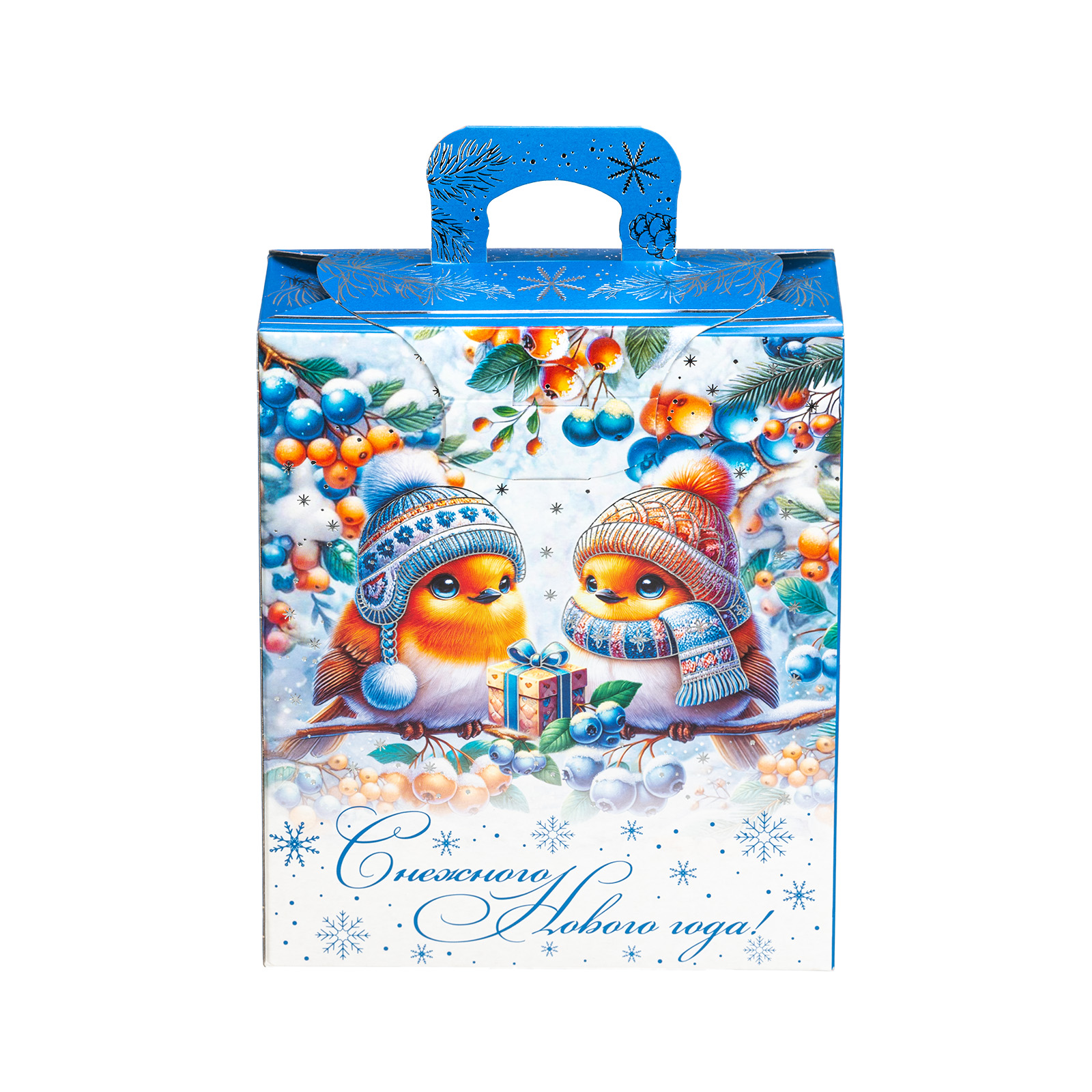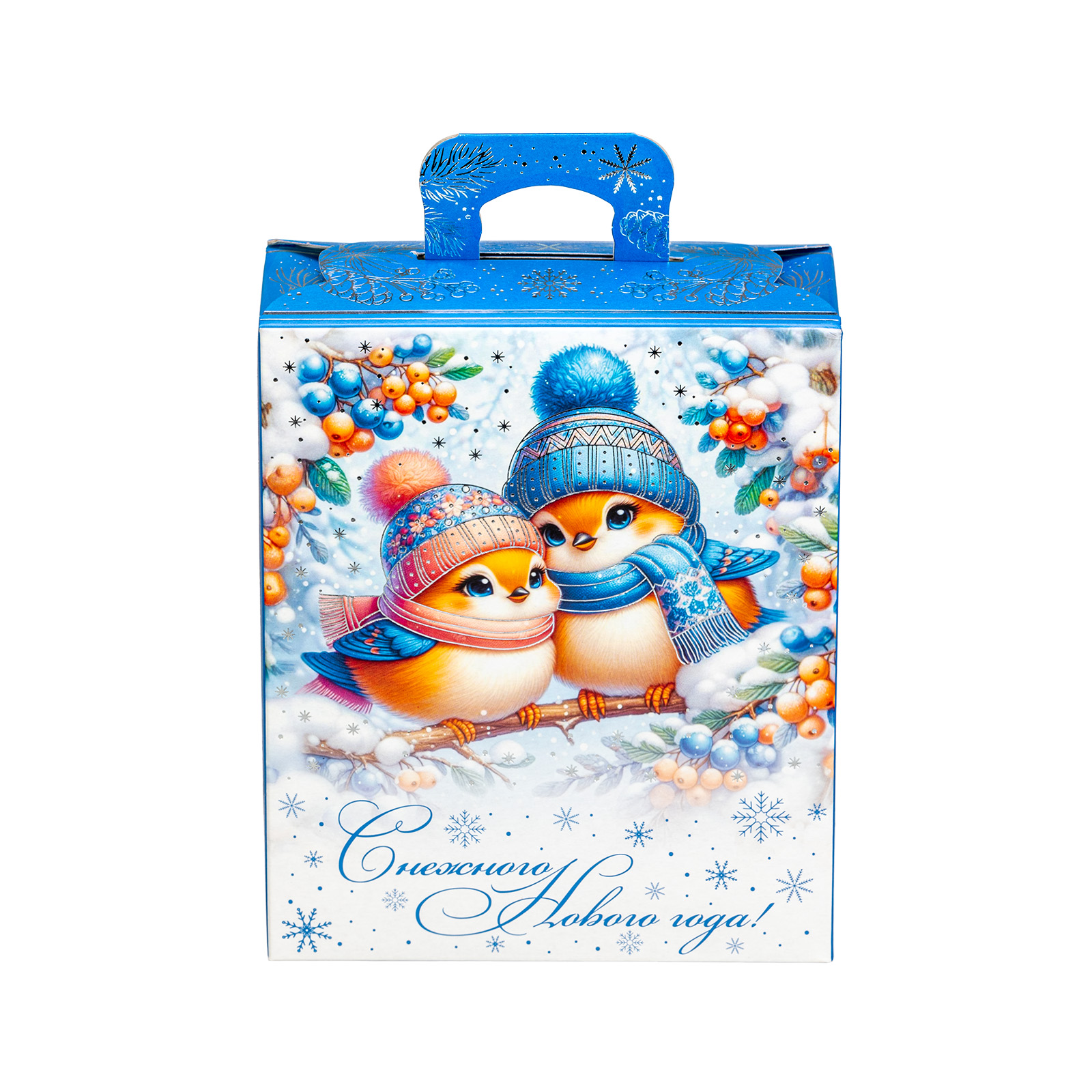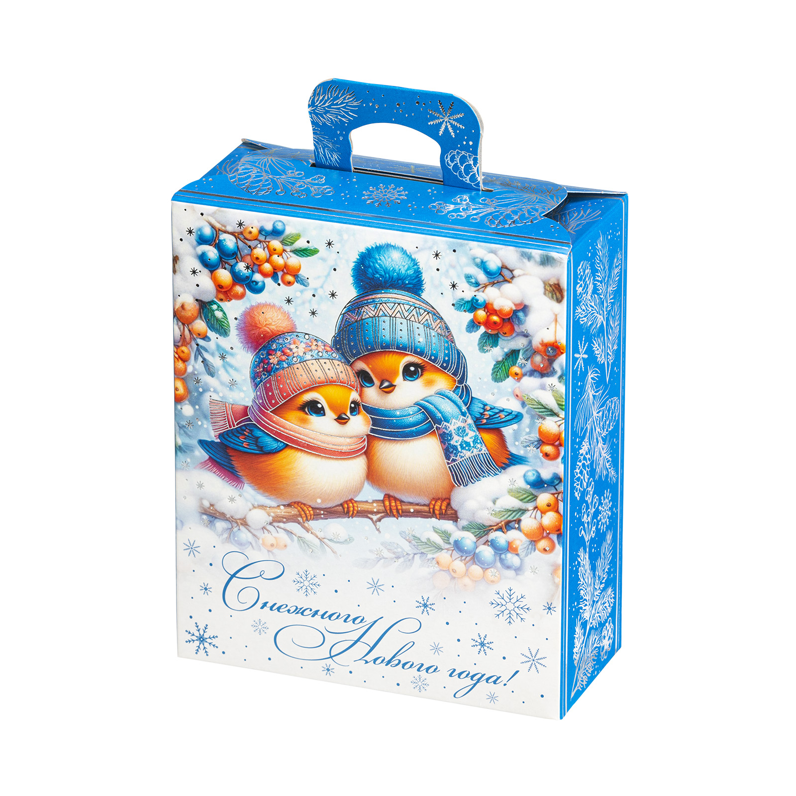Подарочный набор “Зимние птицы” одинаково хорошо подойдет как для мероприятия в детском учреждении, так и для корпоратива в крупной компании. Подарочная упаковка выполнена в виде небольшой картонной коробочки с удобной прорезной ручкой. Со всех сторон подарочный набор украшен разнообразными зимними узорами, а на фронтальной части мы можем увидеть очень милый рисунок - в виде очаровательных снегирей, одетых в шапочки и шарфики. Глядя на эту милую парочку, невольно начинаешь вспоминать о самых дорогих и близких людях и улыбаться. Именно такие теплые и искренние эмоции испытает любой, кому подарят этот чудесный набор - убедитесь в этом сами!