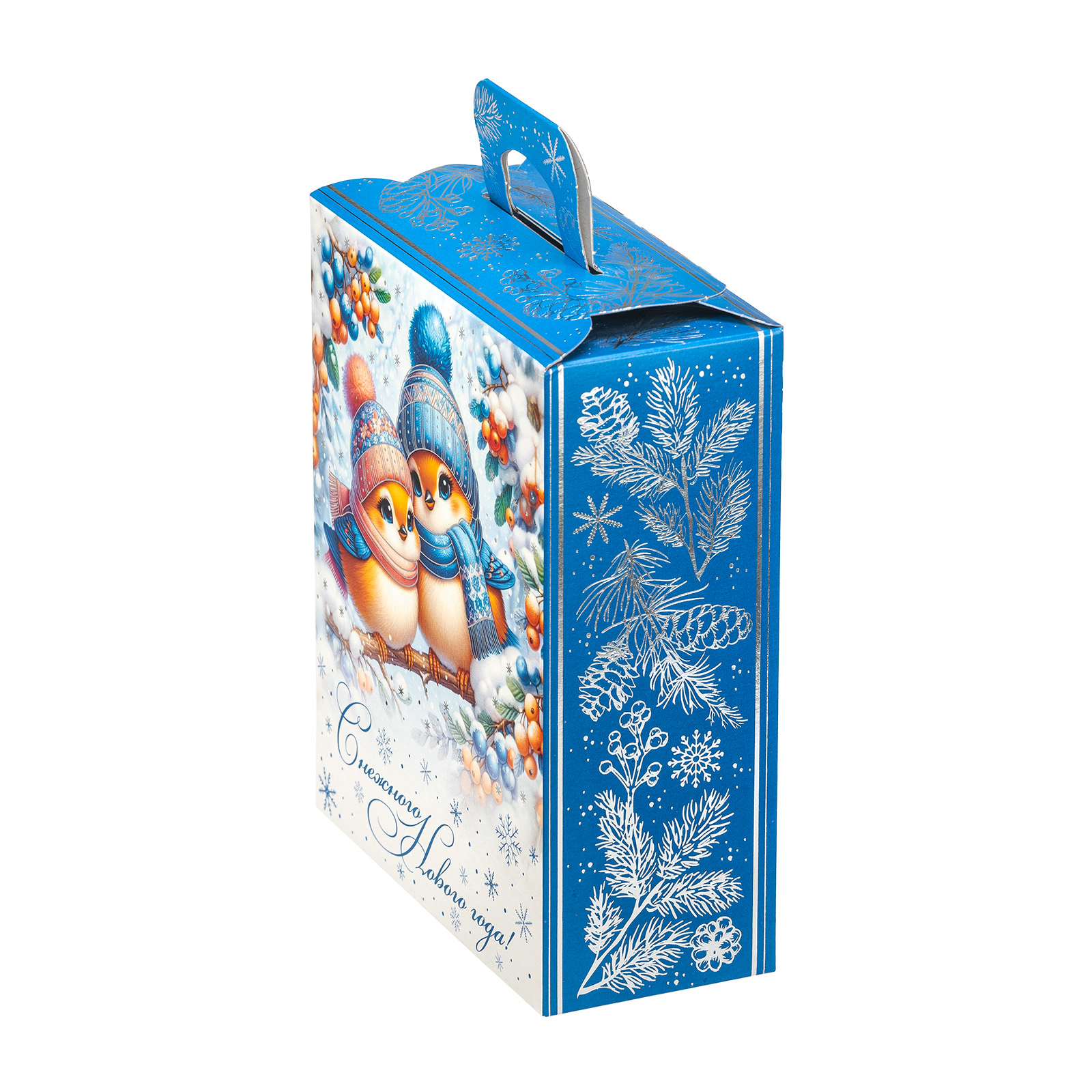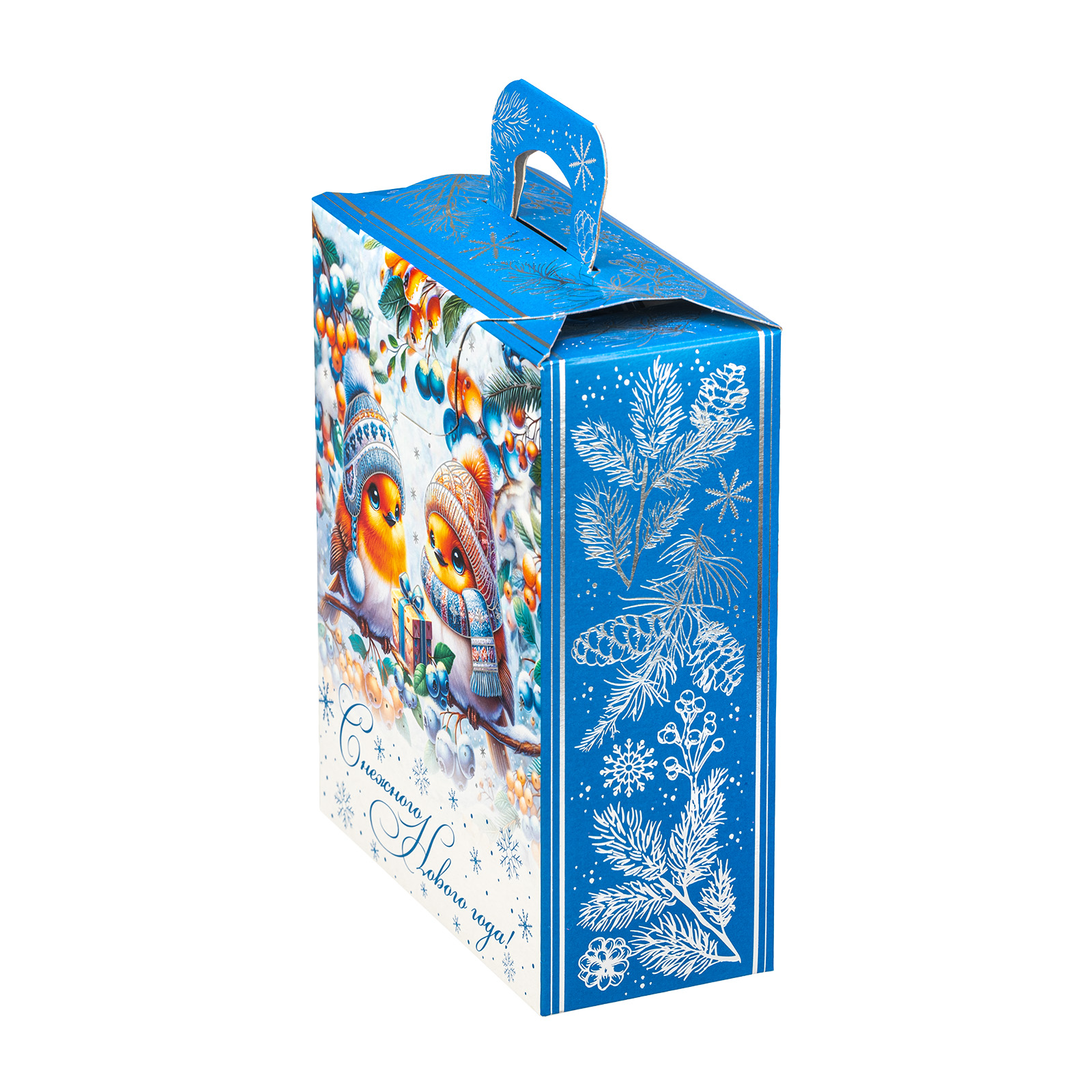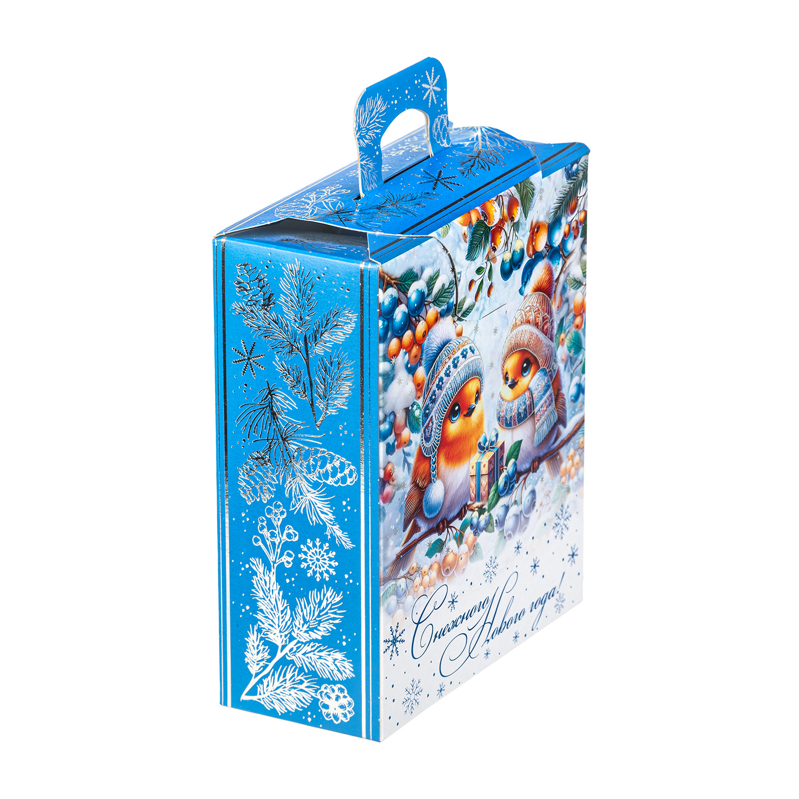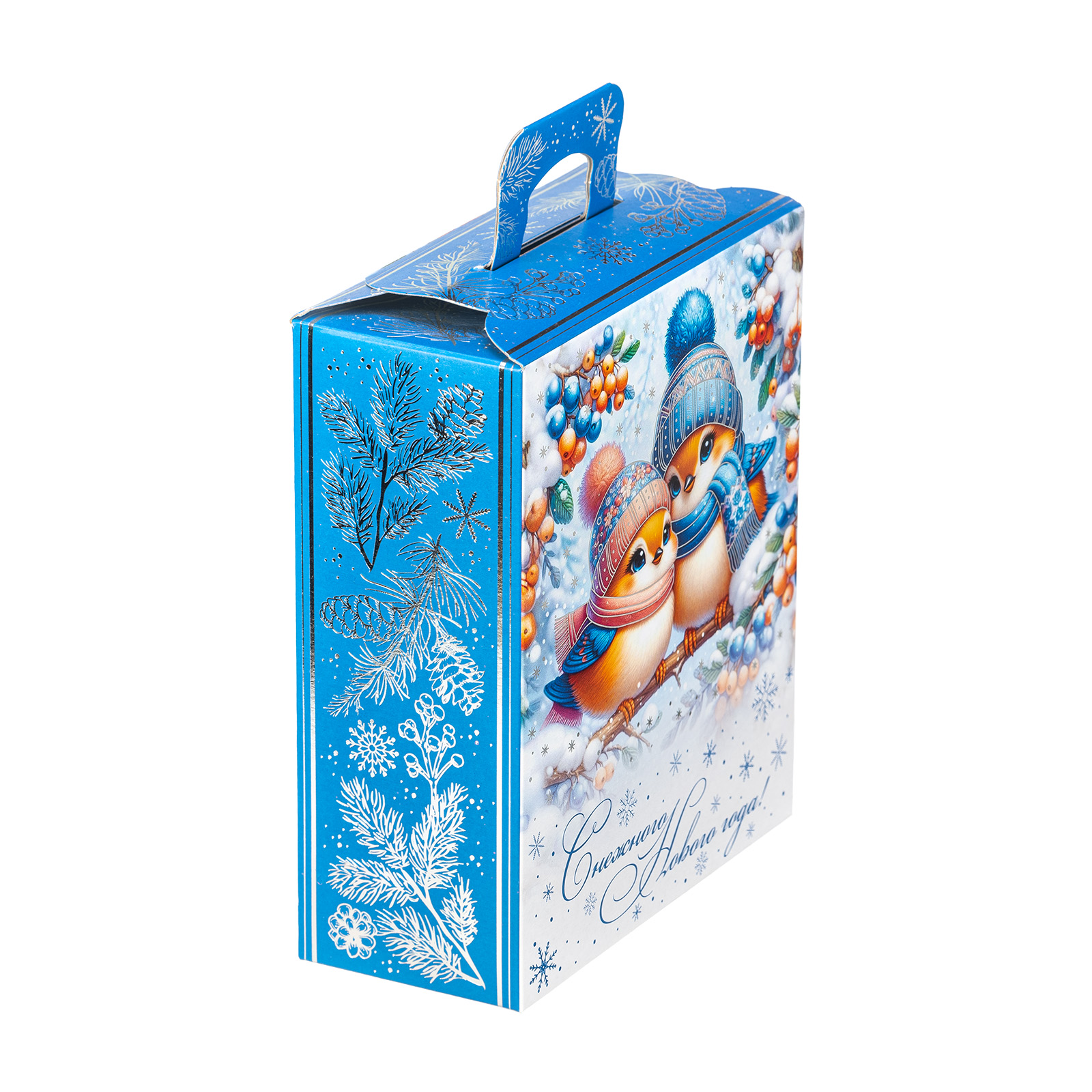 Подарочный набор “Зимние птицы” одинаково хорошо подойдет как для мероприятия в детском учреждении, так и для корпоратива в крупной компании. Подарочная упаковка выполнена в виде небольшой картонной коробочки с удобной прорезной ручкой. Со всех сторон подарочный набор украшен разнообразными зимними узорами, а на фронтальной части мы можем увидеть очень милый рисунок - в виде очаровательных снегирей, одетых в шапочки и шарфики. Глядя на эту милую парочку, невольно начинаешь вспоминать о самых дорогих и близких людях и улыбаться. Именно такие теплые и искренние эмоции испытает любой, кому подарят этот чудесный набор - убедитесь в этом сами!